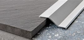 Selbstklebendes, rampenförmiges Übergangsprofil aus Edelstahl mit Schutzfolie für die Verbindung und den Abschluss von Belägen mit 7 bis 12 mm Höhenunterschieden. Der Elastomer-Klebestreifen garantiert optimalen Halt.