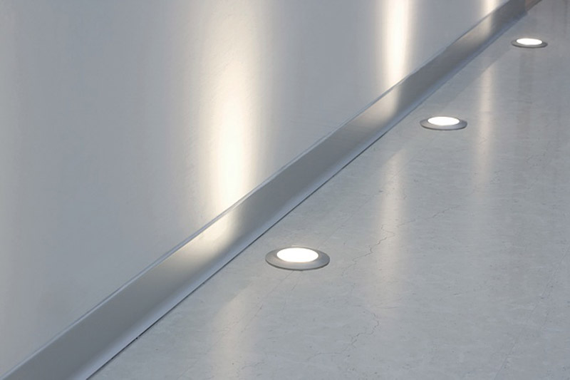 100 mm hohe Sockelleiste aus Edelstahl mit bzw. ohne Klebestreifen, durch edle Optik, große Belastbarkeit und einfache Verlegung ausgezeichnet, ideal für öffentliche und private Bereiche mit hohen ästhetischen und hygienischen Ansprüchen.