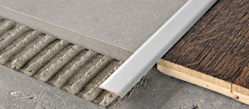 Kleines Fugen-Übergangsprofil für die Einfassung von Belägen gleicher Höhe aus Keramik/Keramik, Keramik/Holz, das die erforderliche Dehnung der Böden gewährleistet.