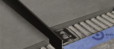 Höhenverstellbares Profil aus satiniertem, entfettetem und passiviertem Edelstahl für den Schutz der Bodenkanten und den Anschluss von eben verlegten Fliesen mit geneigten Fliesenbelägen.