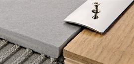Serie de perfiles tapajuntas/remate en umbrales de puerta de acero inoxidable de diferentes anchuras con adhesivo, se utilizan para unir entre sí suelos de igual o diferentes tipos y espesores.